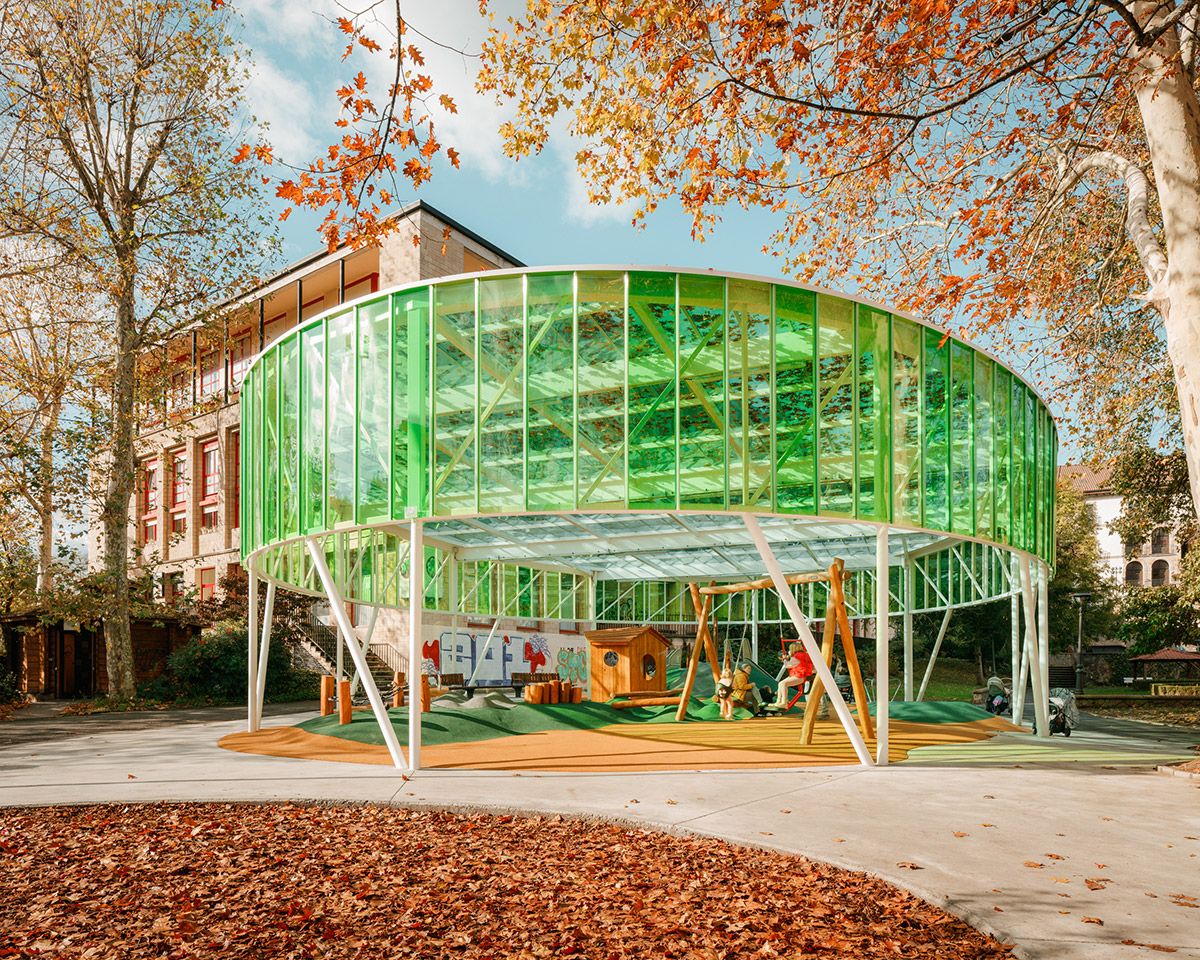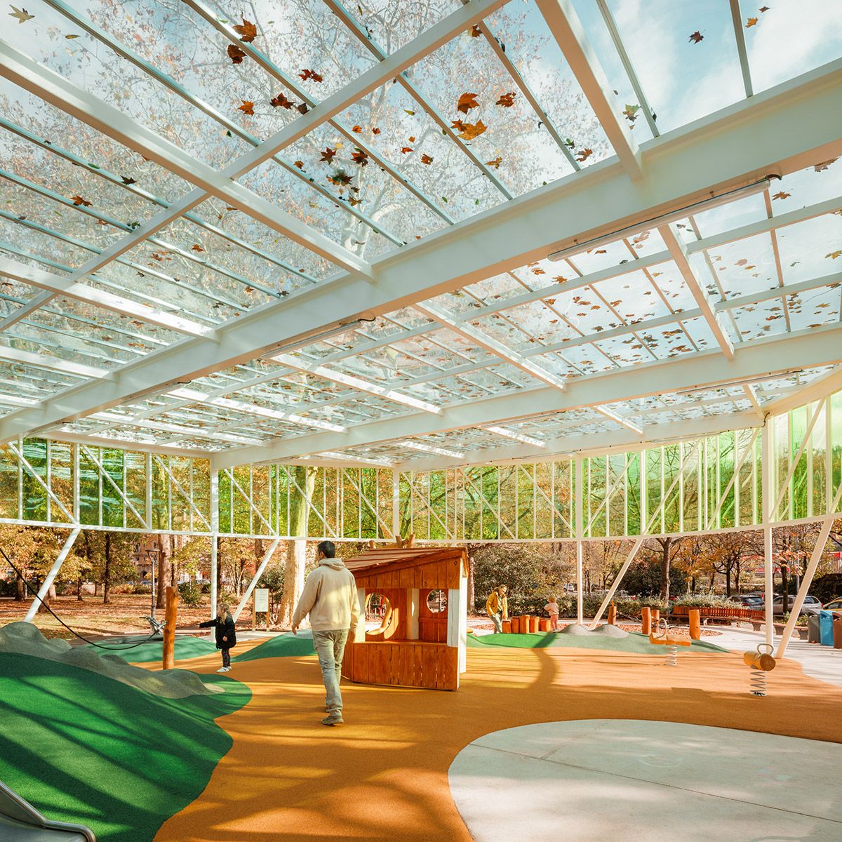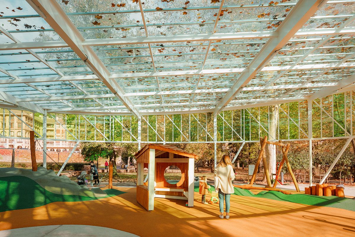 La intervención ha incluido la instalación de una estructura ligera y funcional que cubre la zona de juegos, permitiendo su uso durante todo el año. Se han incorporado juegos inclusivos y seguros, pensados para el desarrollo físico y sensorial de la infancia.