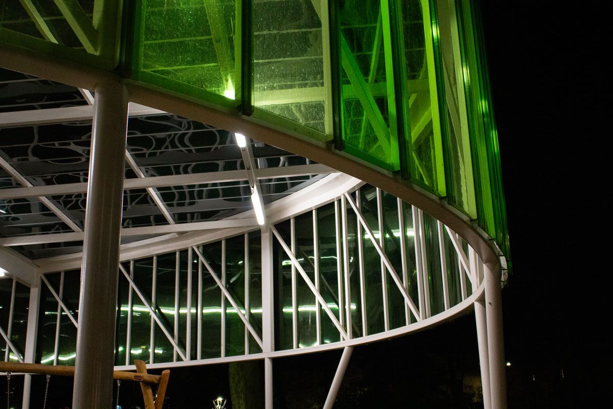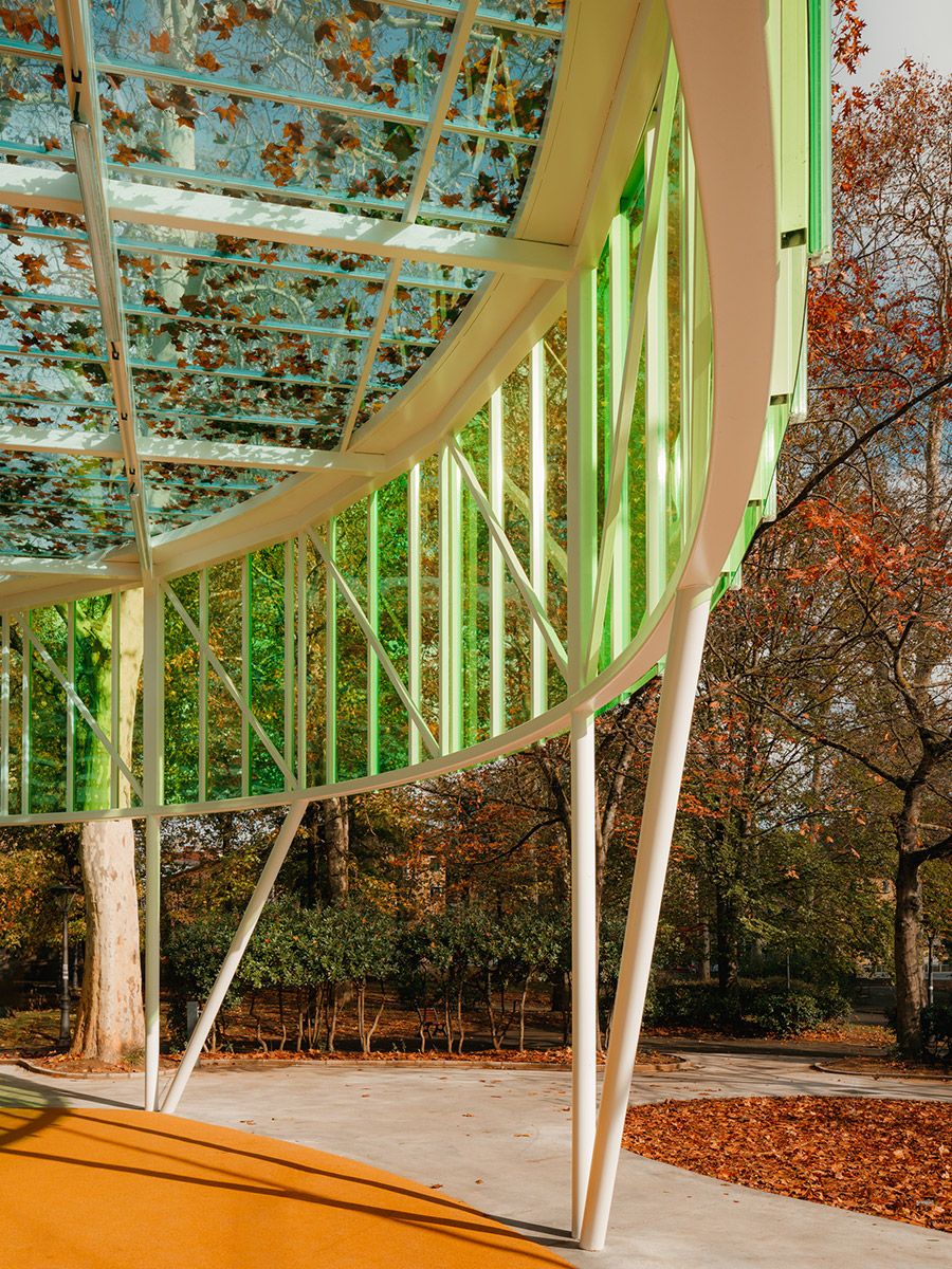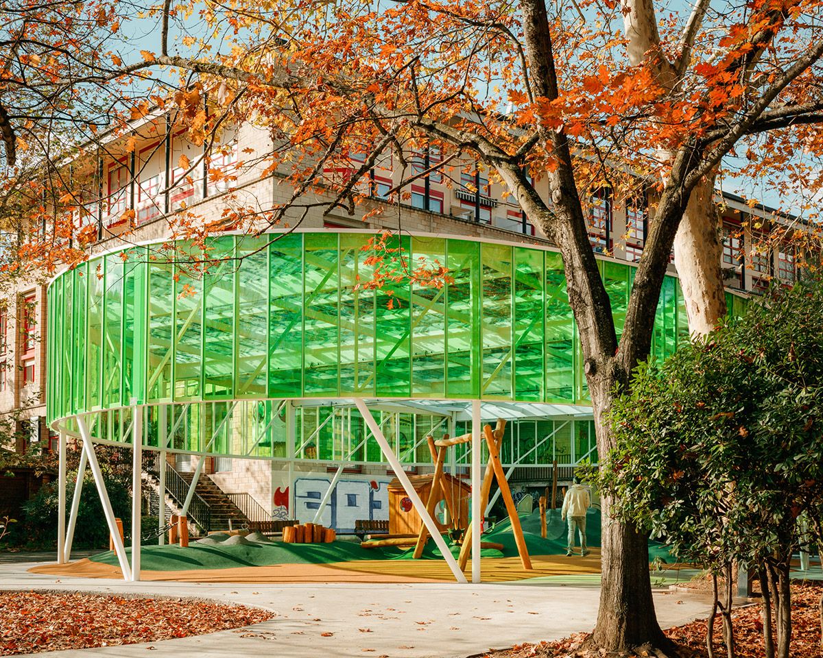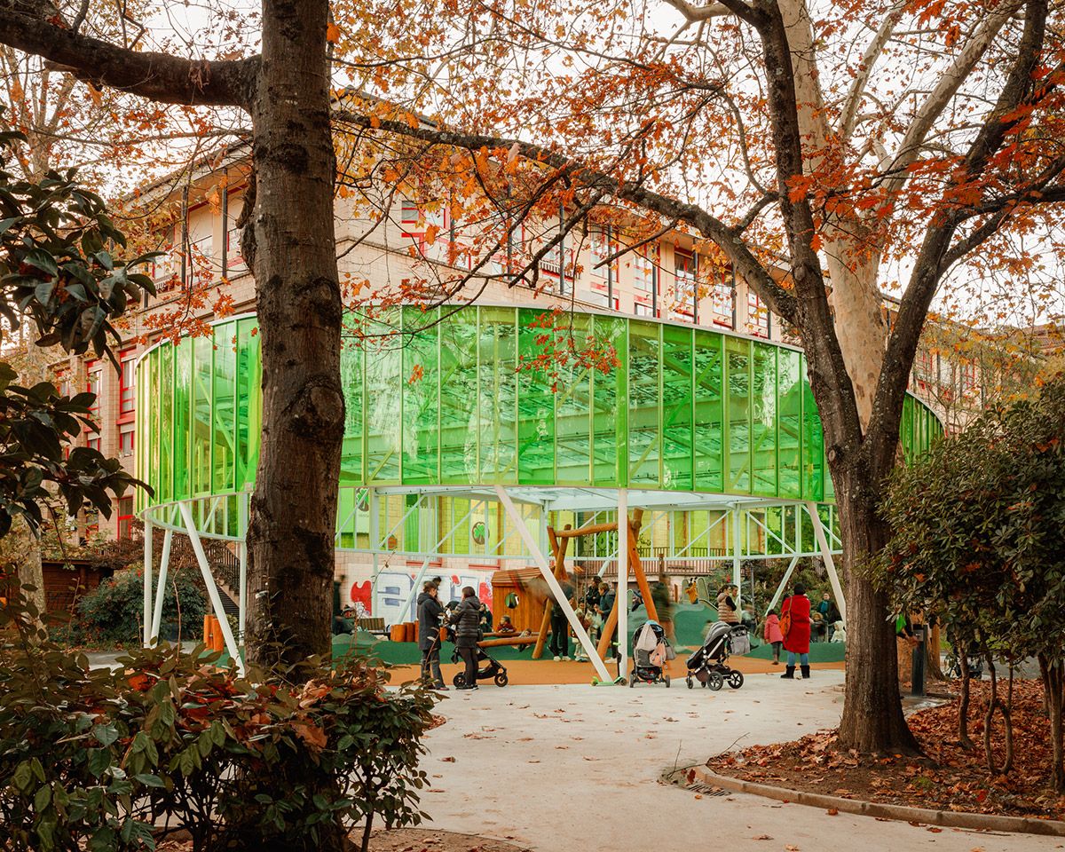 La intervención ha incluido la instalación de una estructura ligera y funcional que cubre la zona de juegos, permitiendo su uso durante todo el año. Se han incorporado juegos inclusivos y seguros, pensados para el desarrollo físico y sensorial de la infancia.